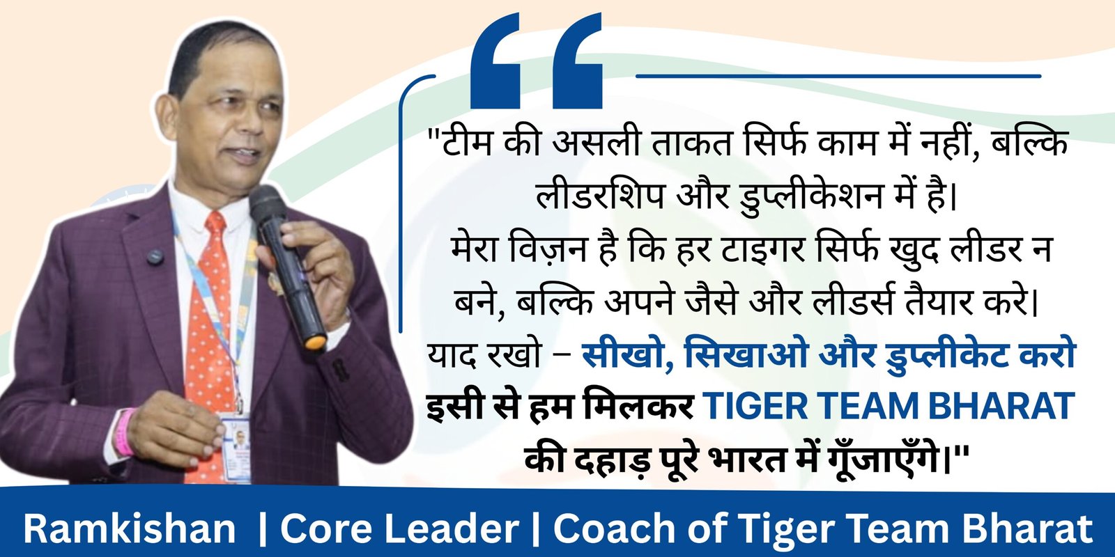 टाइगर टीम भारत RCM अभियान की एक मजबूत सशक्त टीम का संघठन है | टाइगर टीम पूरे भारत में RCM अभियान का प्रचार करती है | आप पार्ट टाइम फुल टाइम RCM अभियान से जुडकर स्वदेशी प्रोडक्ट्स अपने घर में लाकर व् समय का सही उपयोग करके एक बेहतर करियर बना सकते हैं | हर व्यक्ति जो कुछ करना चाहता है , सपने देखने वाले, हर युवा, हर गृहिणी और हर पेशेवर को इस स्वदेशी डायरेक्ट सेलिंग में आमंत्रित करती है | आरसीएम स्वदेशी अभियान से जुड़कर, हम शुद्ध प्रोडक्ट्स खरीदेंगे व् अपने परिवार को स्वास्थ्य बना सकते हैं | RCM अभियान में ज्वाइन होना बहुत आसान है व् अलग से कुछ अलग नहीं करना है बस केवल अपना खरीद करने का तरीका बदलना है |